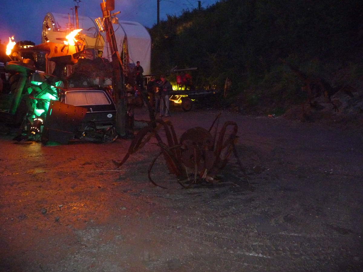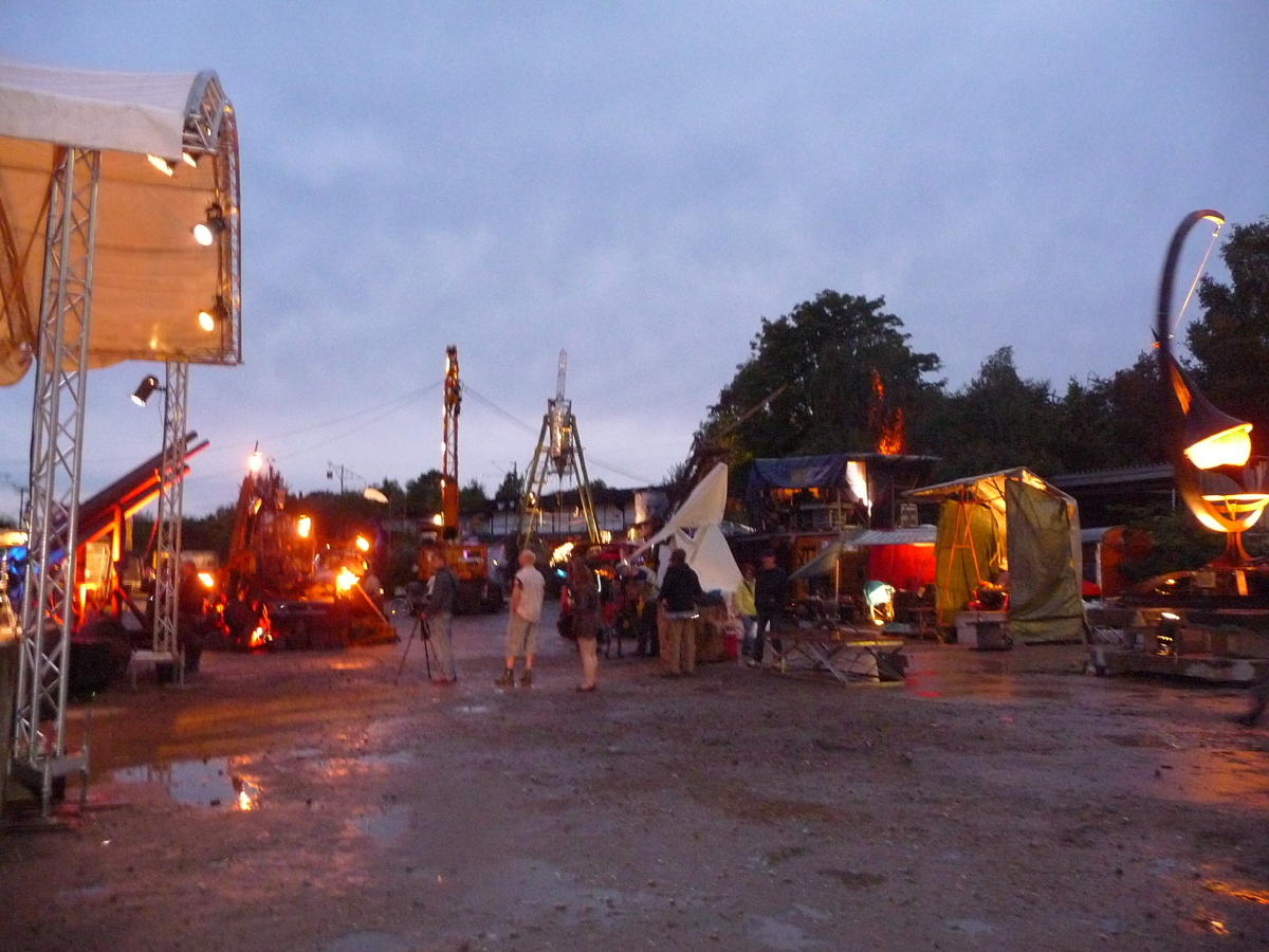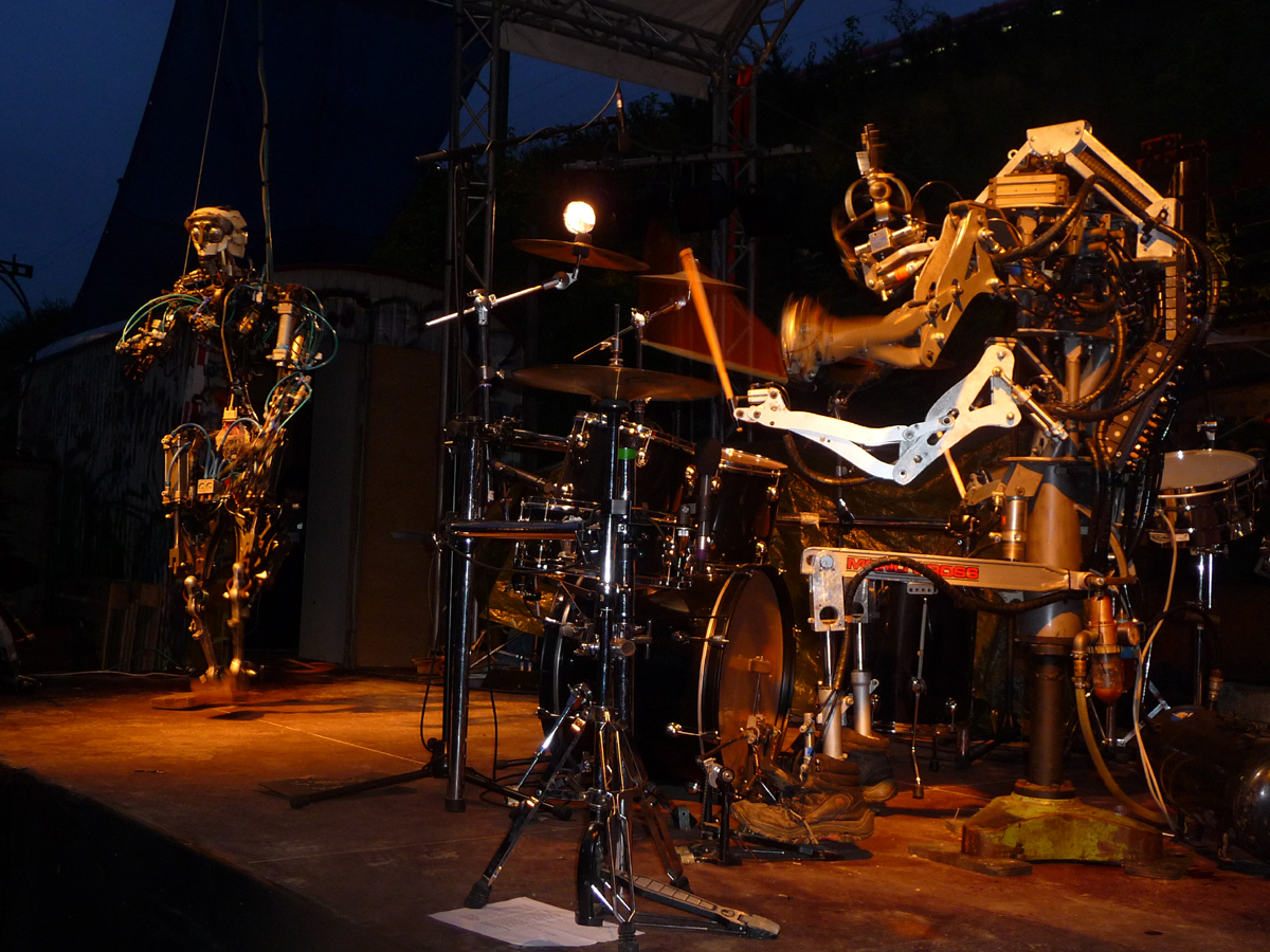 Es gab sehr interessante und beeindruckende Robots zu sehen, z.B den vierarmigen Schlagzeuger Stickboy (www.robocross.de), Kernschrottrobots (www.kernschrottrobots.de) tanzten dazu, Klingende mit Gas betriebene Riesenrohre (Bastiaan Maris), Jim Whitings (www.bimbotown.de) Hemdenwurfmaschine, Eddie Egals (www.pyromancer.eu) Feuermaschinen und jede Menge mehr. Besonders beeindruckt war ich auch vom ganzen Ambiente auf dem Platz. Ungefähr so hat sich der Cyberpunk das postinformelle Zeitalter vorgestellt, nur dass die Bevölkerung in Robodonien sehr freundlich ist :-)