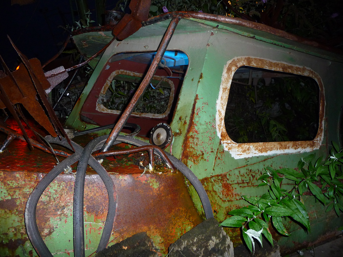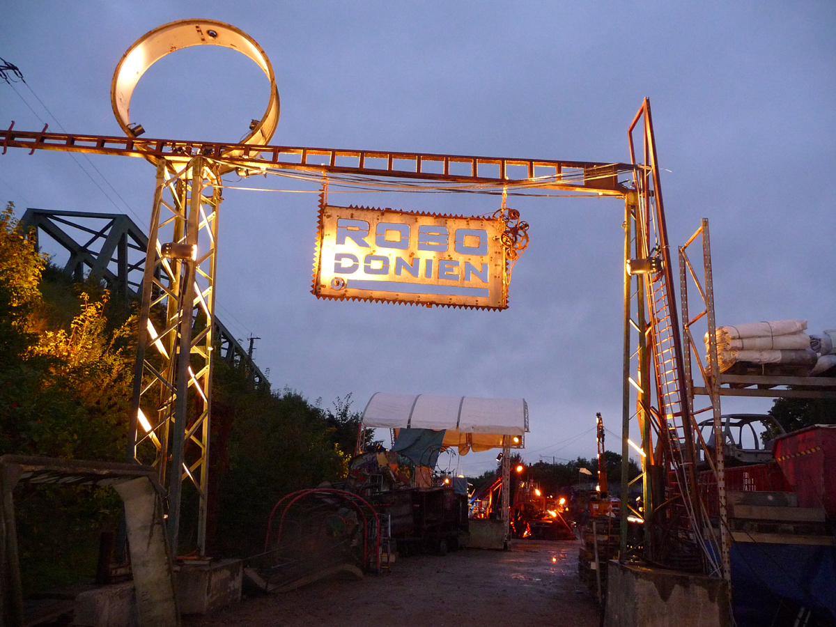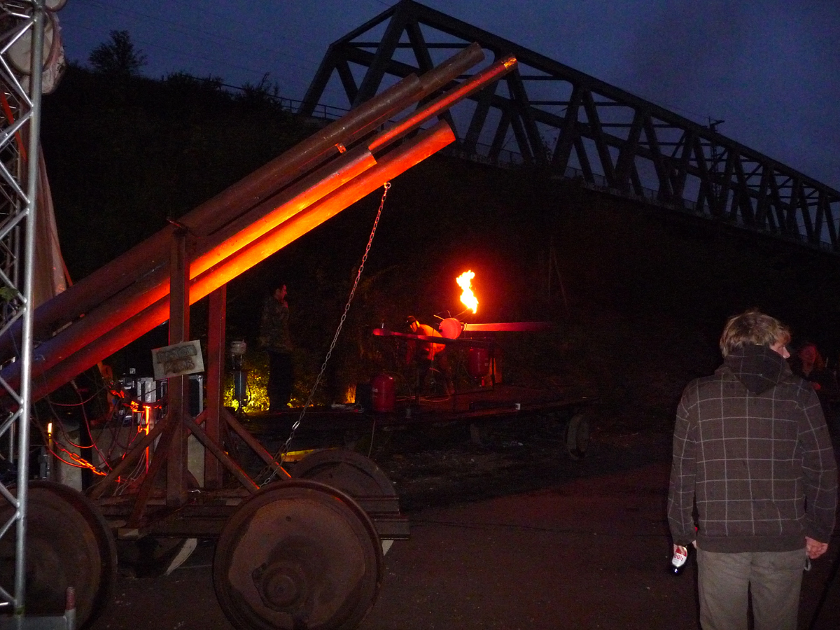 Es gab sehr interessante und beeindruckende Robots zu sehen, z.B den vierarmigen Schlagzeuger Stickboy (www.robocross.de), Kernschrottrobots (www.kernschrottrobots.de) tanzten dazu, Klingende mit Gas betriebene Riesenrohre (Bastiaan Maris), Jim Whitings (www.bimbotown.de) Hemdenwurfmaschine, Eddie Egals (www.pyromancer.eu) Feuermaschinen und jede Menge mehr. Besonders beeindruckt war ich auch vom ganzen Ambiente auf dem Platz. Ungefähr so hat sich der Cyberpunk das postinformelle Zeitalter vorgestellt, nur dass die Bevölkerung in Robodonien sehr freundlich ist :-)