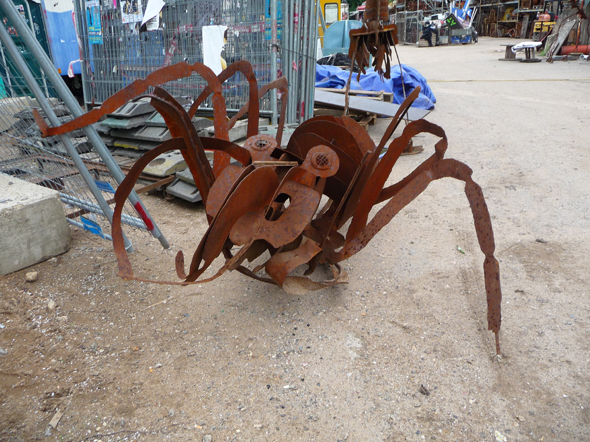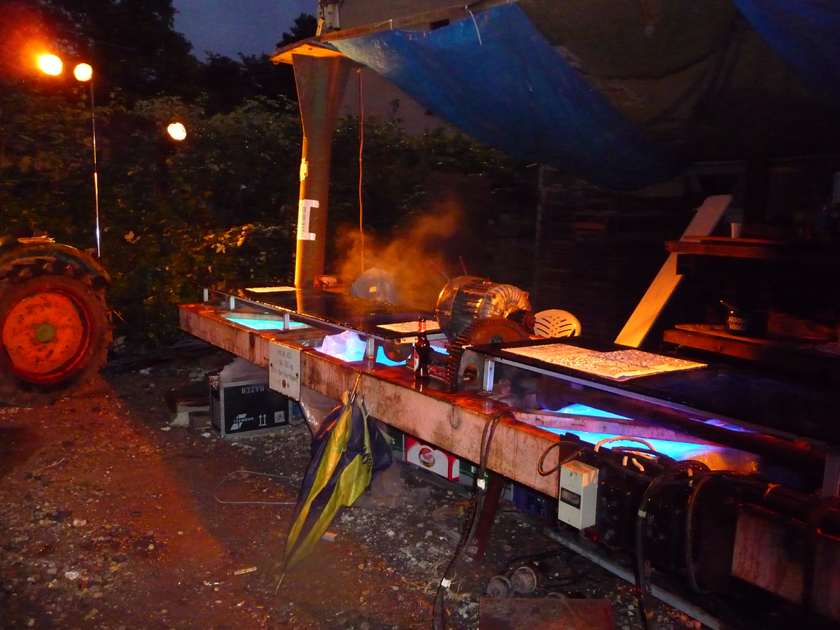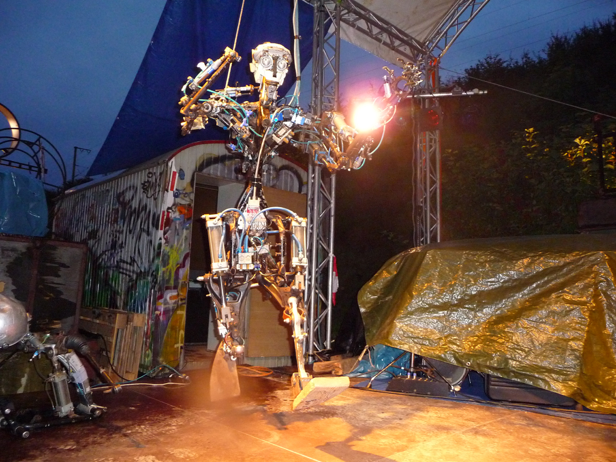 Es gab sehr interessante und beeindruckende Robots zu sehen, z.B den vierarmigen Schlagzeuger Stickboy (www.robocross.de), Kernschrottrobots (www.kernschrottrobots.de) tanzten dazu, Klingende mit Gas betriebene Riesenrohre (Bastiaan Maris), Jim Whitings (www.bimbotown.de) Hemdenwurfmaschine, Eddie Egals (www.pyromancer.eu) Feuermaschinen und jede Menge mehr. Besonders beeindruckt war ich auch vom ganzen Ambiente auf dem Platz. Ungefähr so hat sich der Cyberpunk das postinformelle Zeitalter vorgestellt, nur dass die Bevölkerung in Robodonien sehr freundlich ist :-)